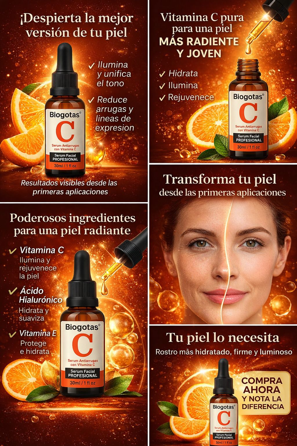 Dale a tu piel el cuidado que se merece con Biogotas Vitamina C, un sérum facial profesional diseñado para transformar visiblemente tu rostro desde las primeras aplicaciones. Su fórmula avanzada actúa en profundidad para devolverle a tu piel luminosidad, firmeza y juventud.